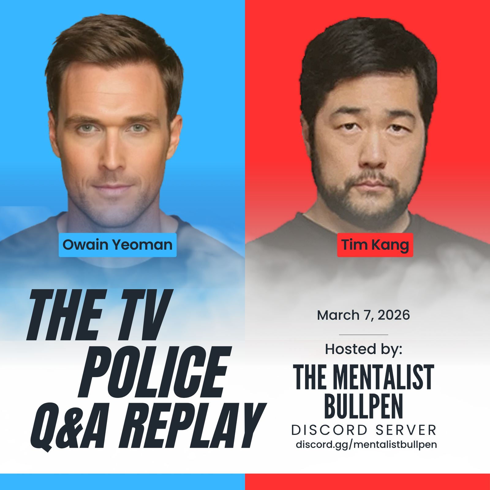 This episode is a recording of the TV Police Q&A event with Owain Yeoman and Tim Kang that was held in the Mentalist Bullpen Discord server on March 7, 2026, moderated by Crystal Watanabe.